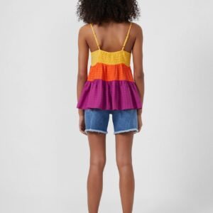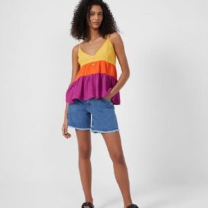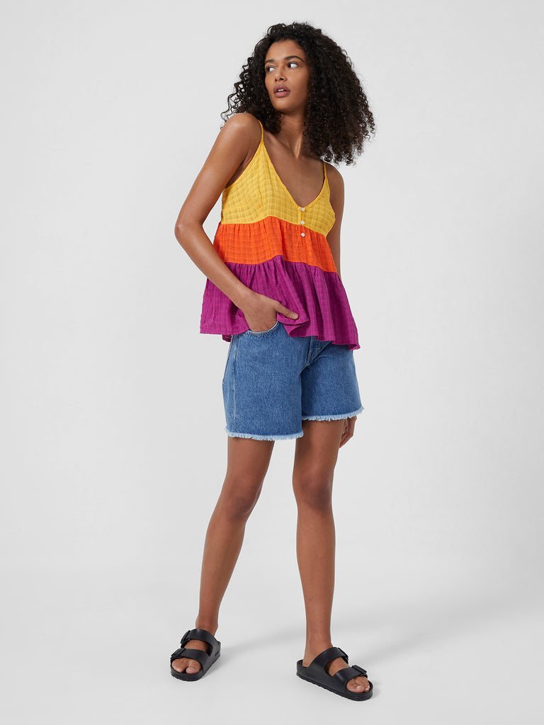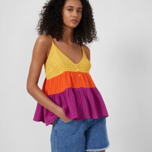 The Adira Birch Tiered Strappy Top is all about bright and beautiful block colors. An understated texture design is brought to life with a trio of lively summer colors, complete with v-neck, button details, adjustable straps and playful peplum hem.