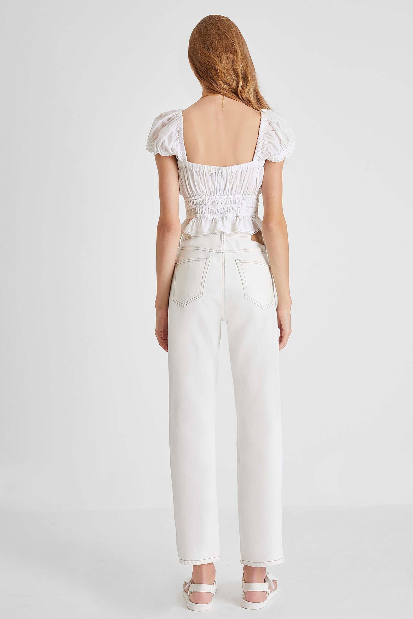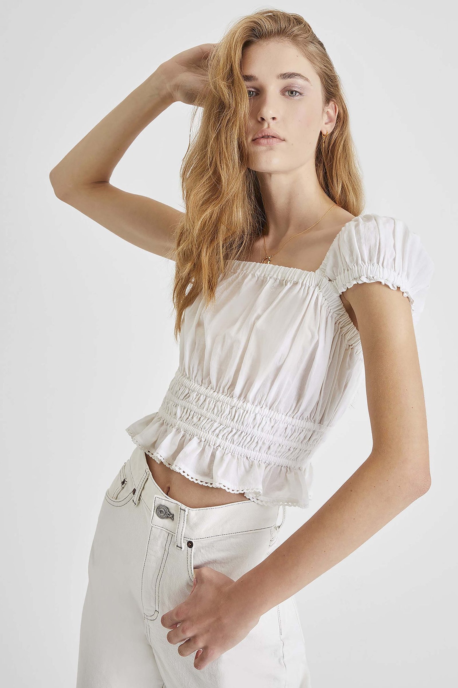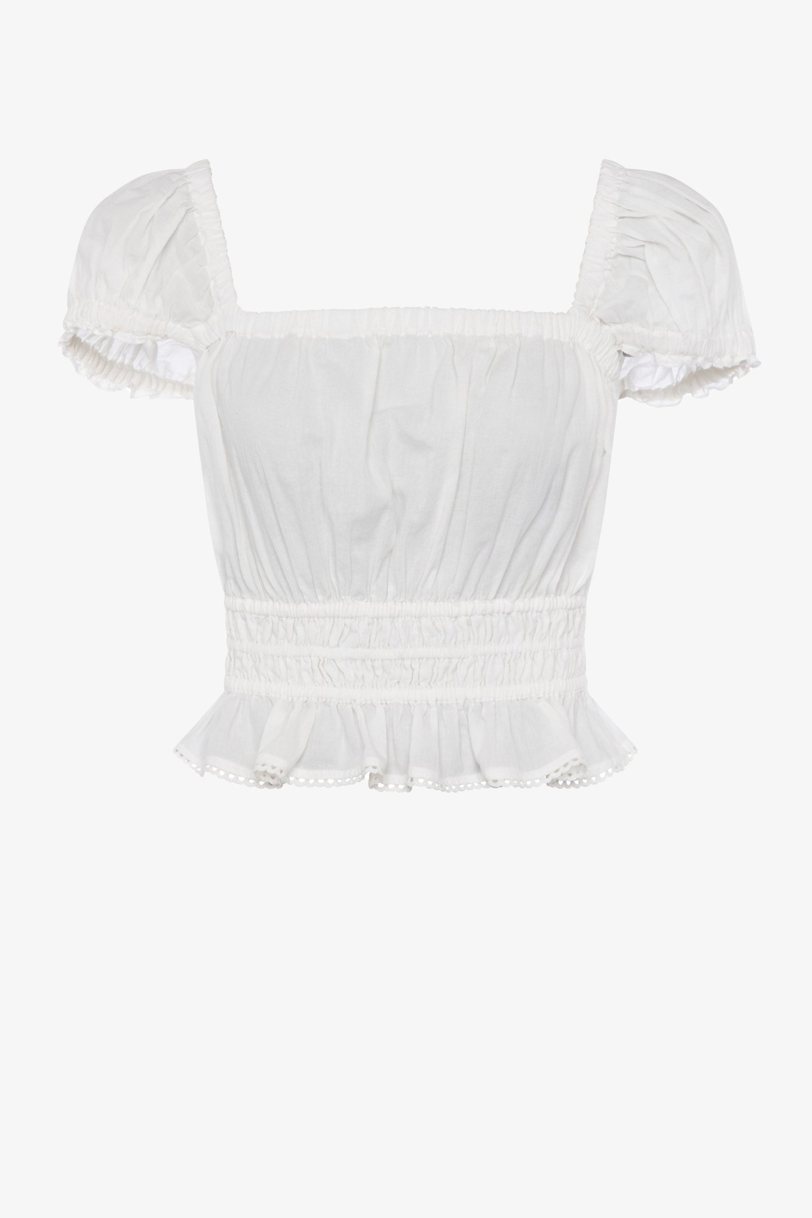 Perfect for soaking up ample sunrays on your days off, our Almo Square Neck Top features ruffled accents, cap sleeves and Victorian-inspired square neckline.